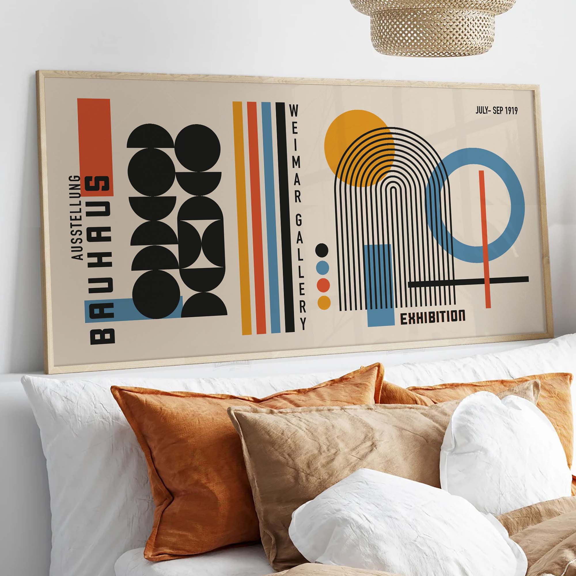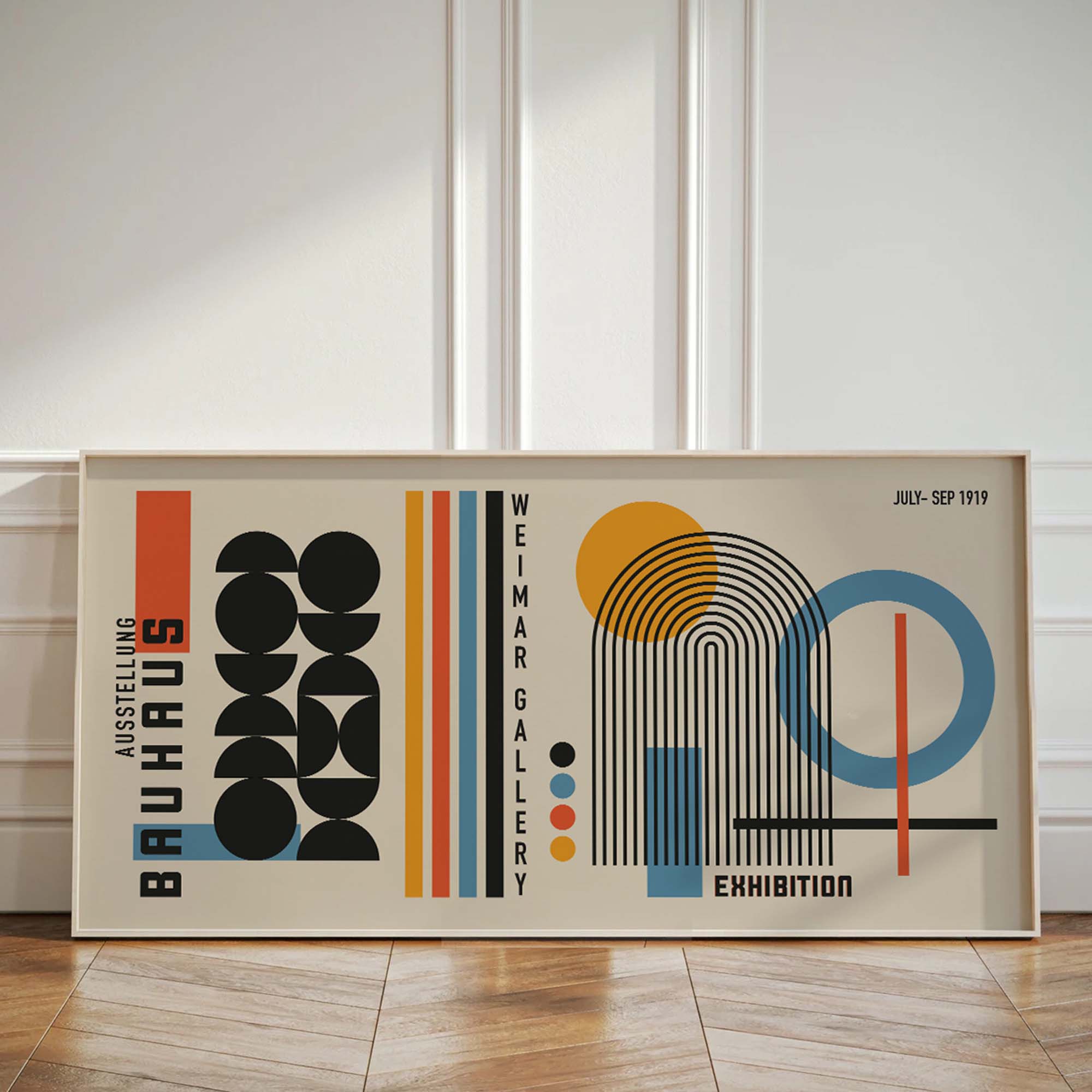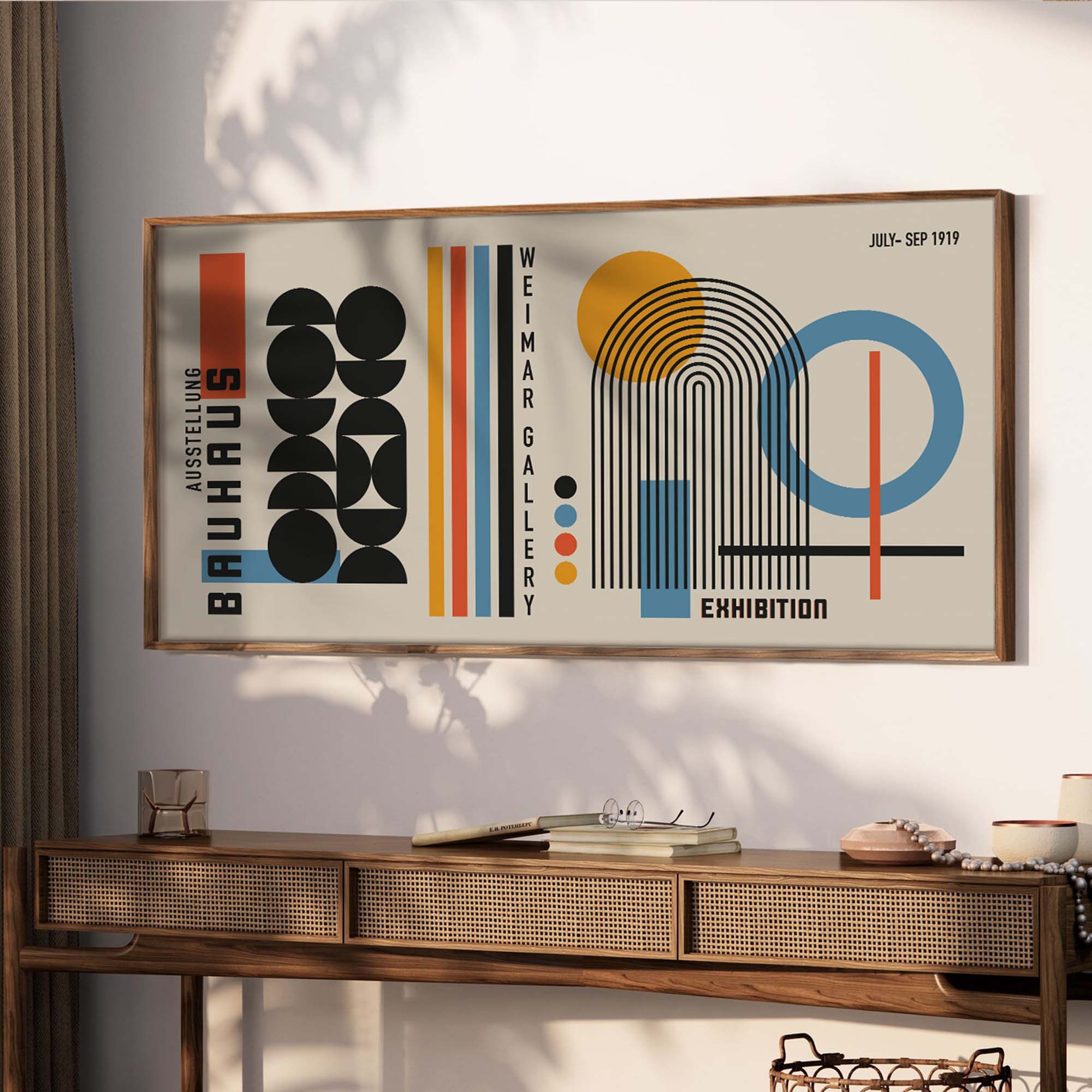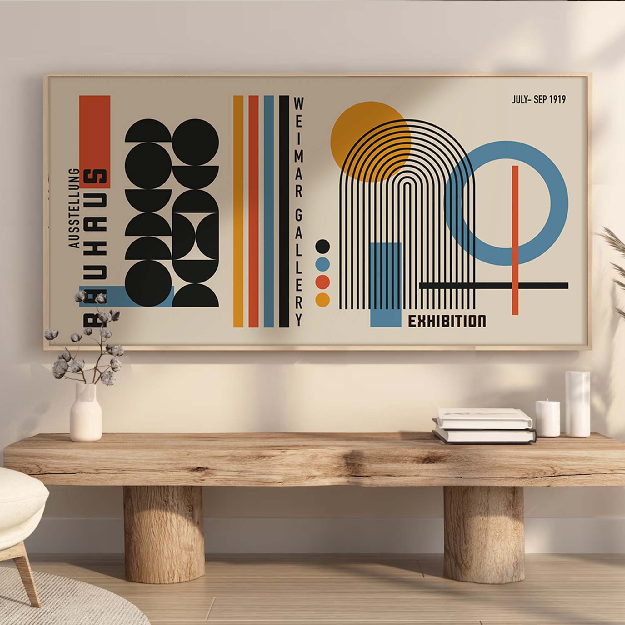 Moreover, this Bauhaus minimalist print isn’t just decor—it’s a piece of history. Inspired by the revolutionary Weimar exhibit of 1919, it captures the innovative spirit of the Bauhaus movement. However, its clean lines and bold colors feel strikingly modern, making it perfect for contemporary interiors. Additionally, the high-quality materials ensure it remains vibrant for years.