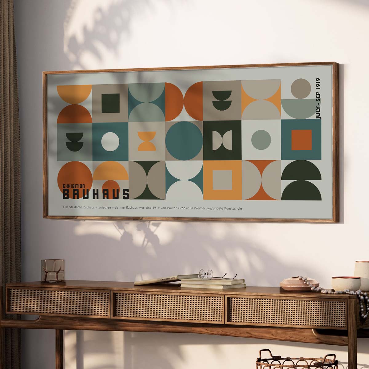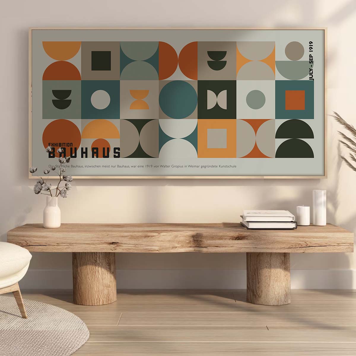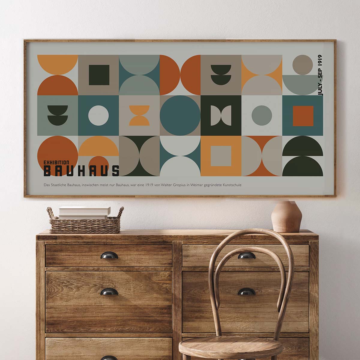Moreover, the Bauhaus Geometric Art Print celebrates the 1919 Weimar founding of the Bauhaus school, as noted on the poster itself. Its clean lines and abstract forms make it a versatile piece for various aesthetics. For instance, it pairs beautifully with neutral tones or can serve as a focal point in a gallery wall setup. Additionally, this print is ideal for art lovers who appreciate the historical significance of the Bauhaus movement and its influence on modern design.