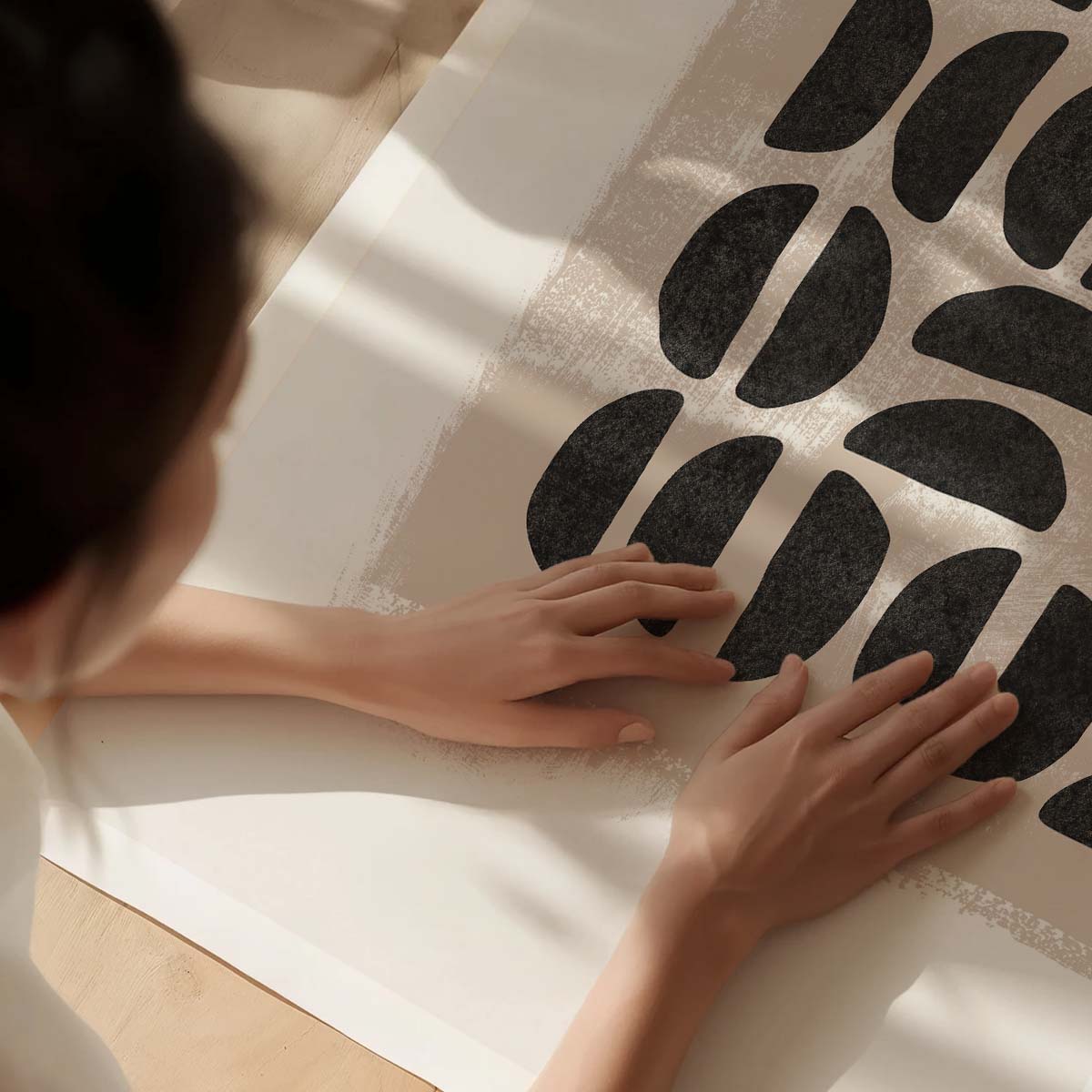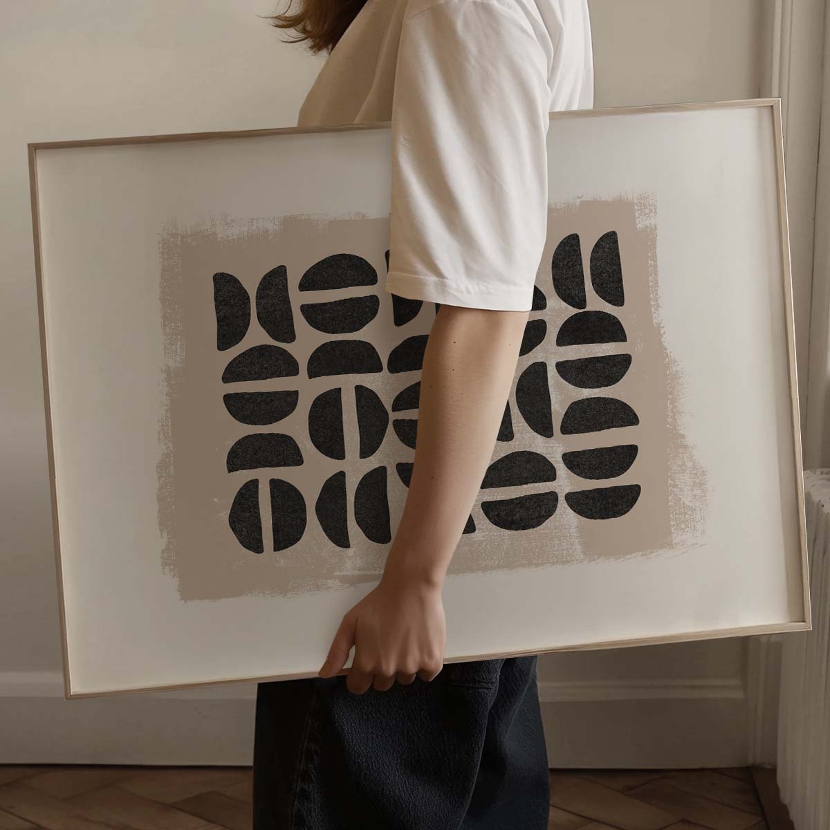 Transform your home with this Chic Abstract Print, a stunning addition for boho living room decor. Featuring bold black geometric shapes on a textured beige background, this artwork brings a perfect blend of modern and earthy vibes to your space. Because of its neutral tones, it seamlessly fits into various settings, such as a living room, bedroom, or cozy office nook.