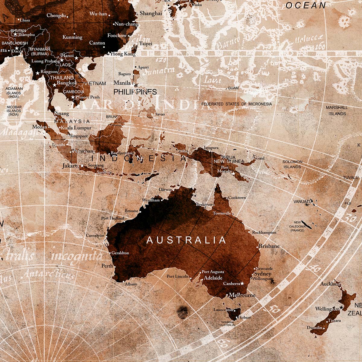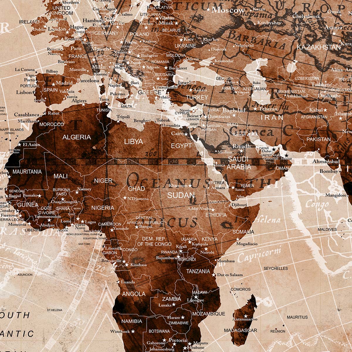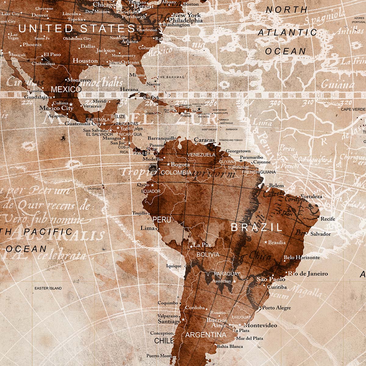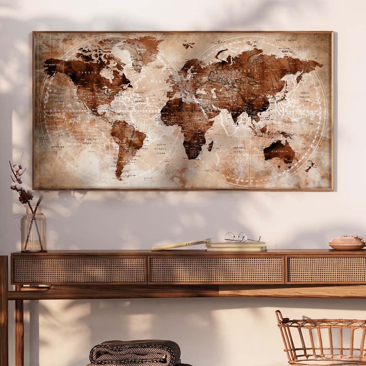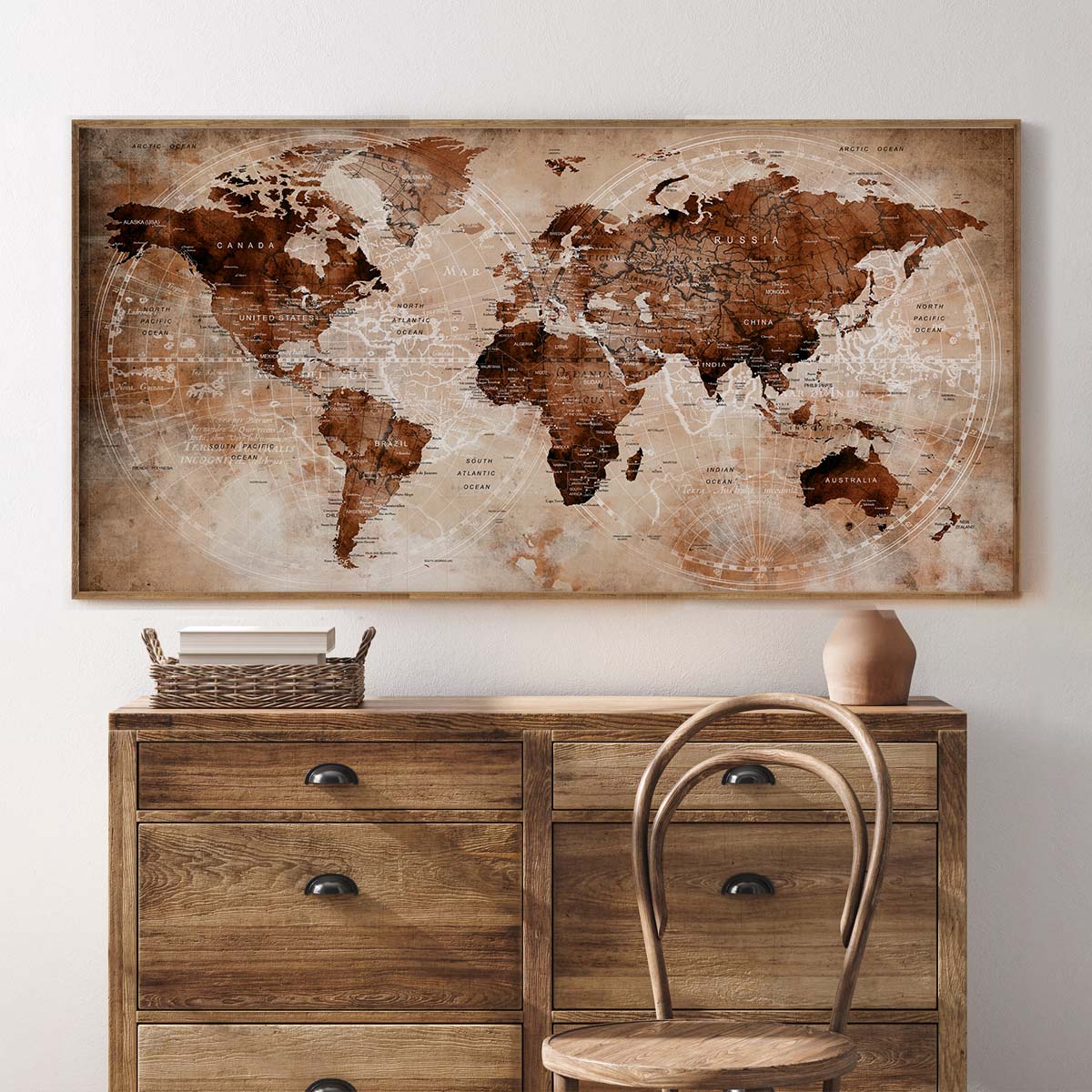 Document your adventures with the elegant Push Pin Trip Map, a perfect companion for travel enthusiasts and explorers. This unique world map features a vintage sepia-toned design with a distressed, parchment-like texture, making it an ideal canvas to mark your journeys with push pins. Because of its nostalgic aesthetic, it enhances any space, from a cozy study to a travel-inspired living room. Therefore, it becomes a cherished piece for those who love to showcase their global travels with style.